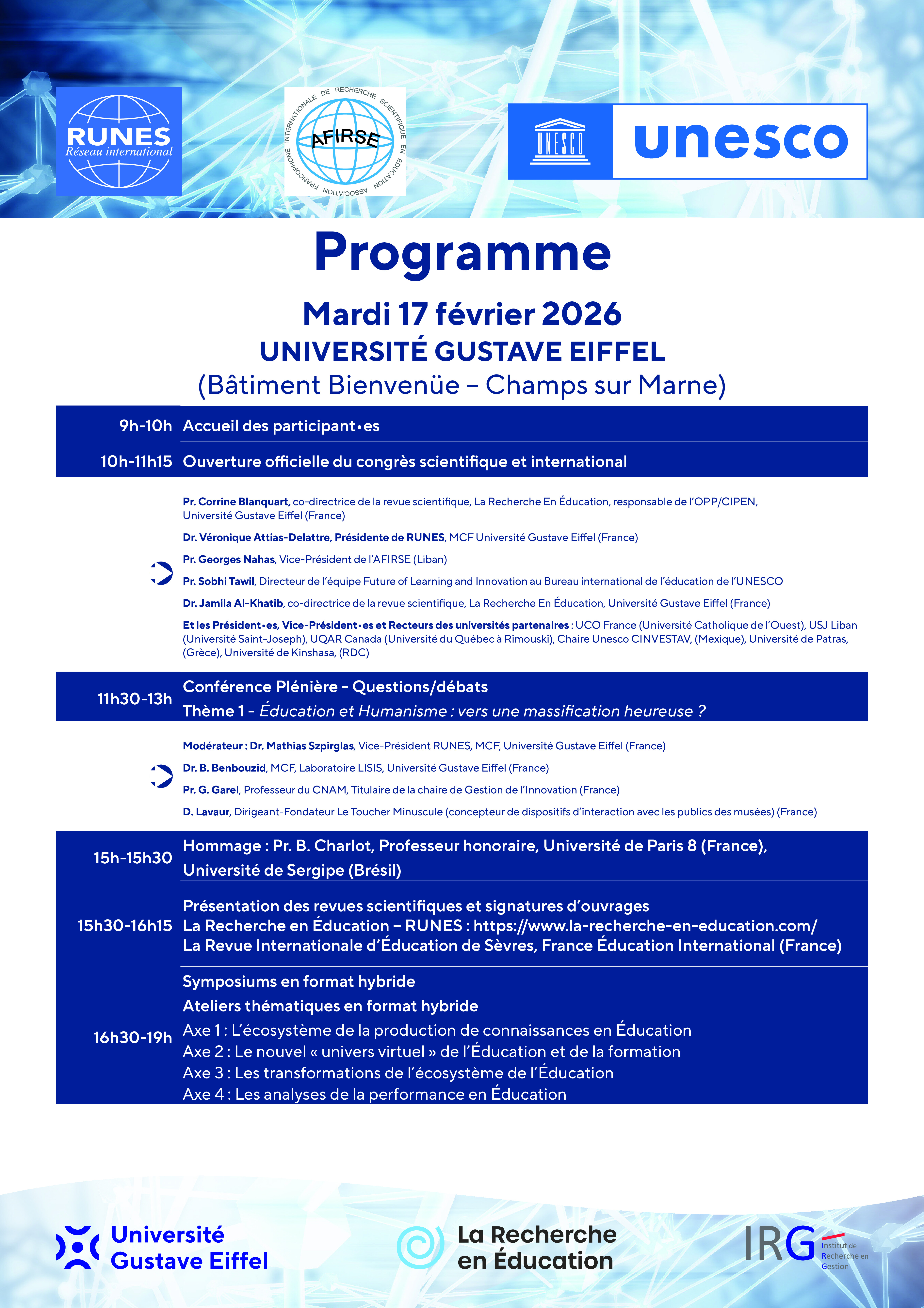 Congrès scientifique international et francophone, RUNES/AFIRSE – UNESCO – Université Gustave Eiffel - aura lieu du 17 au 20 février 2026