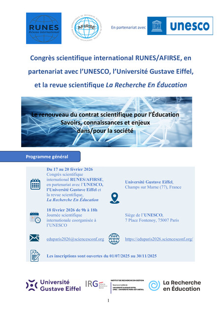 Congrès scientifique international et francophone, RUNES/AFIRSE – UNESCO – Université Gustave Eiffel - aura lieu du 17 au 20 février 2026